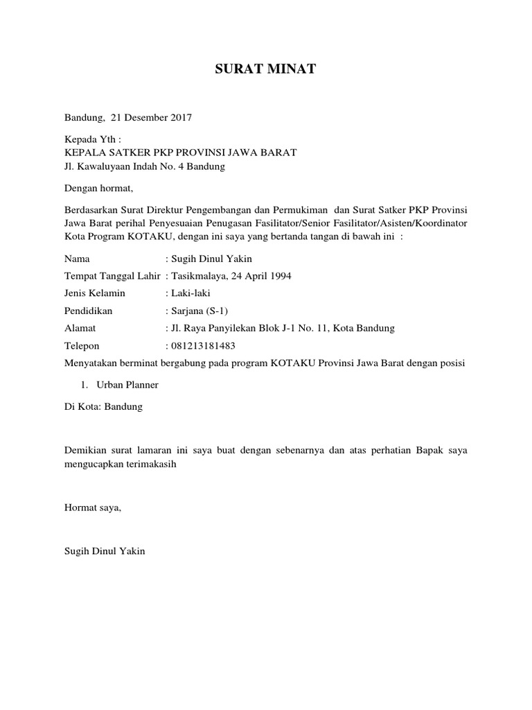 Berikut contoh surat lamaran kerja untuk fresh graduate setingkat sma dan smk yang baik dan benar sesuai dengan syarat dan format penulisan. Surat lamaran ditujukan ke panitia rekrutmen personil program kotaku prov. Cpns 2013 kpu komisi pemilihan umum 44 formasi. Adapun seluruh data dan dokumen yang saya berikan adalah benar. Walikota batam lingkungan pemerintah kota c.q. Besar harapan saya agar bisa di terima apotik kima farma ini. Surat lamaran kota ku admin mei 17, 2021 membuat surat lamaran pekerjaan terbaru 2021 yang baik dan benar merupakan hal yang wajib dilakukan oleh para pencari kerja. Tanggal ditulis sesuai dengan waktu pendaftaran. Contoh surat lamaran kerja di kapal dalam bahasa inggris have an image from the other.contoh surat lamaran kerja di kapal dalam bahasa inggris it also will include a picture of a sort that could be observed in the gallery of contoh surat lamaran kerja di kapal dalam bahasa inggris. 3 contoh surat lamaran kerja yang mudah diterima hrd. Lamaran menjadi cpns daerah kota makassar. Rizki da malah unggah kalimat galauh. Contoh surat lamaran bpjs mathieu comp sci.